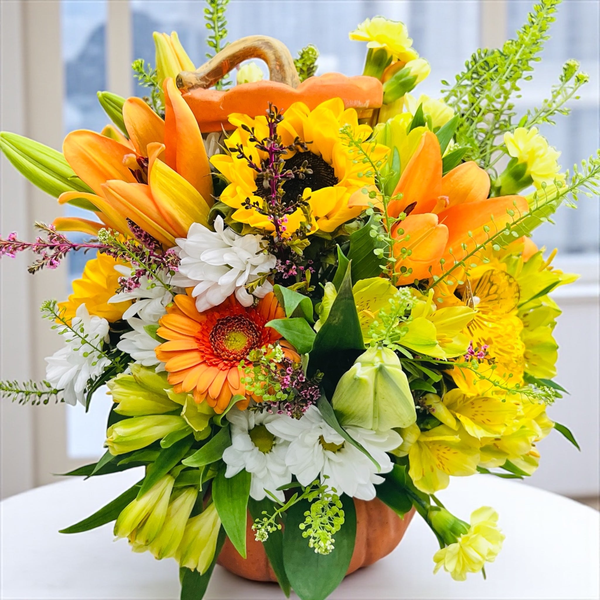 - This charming pumpkin arrangement , bursting with sunflowers and seasonal blooms